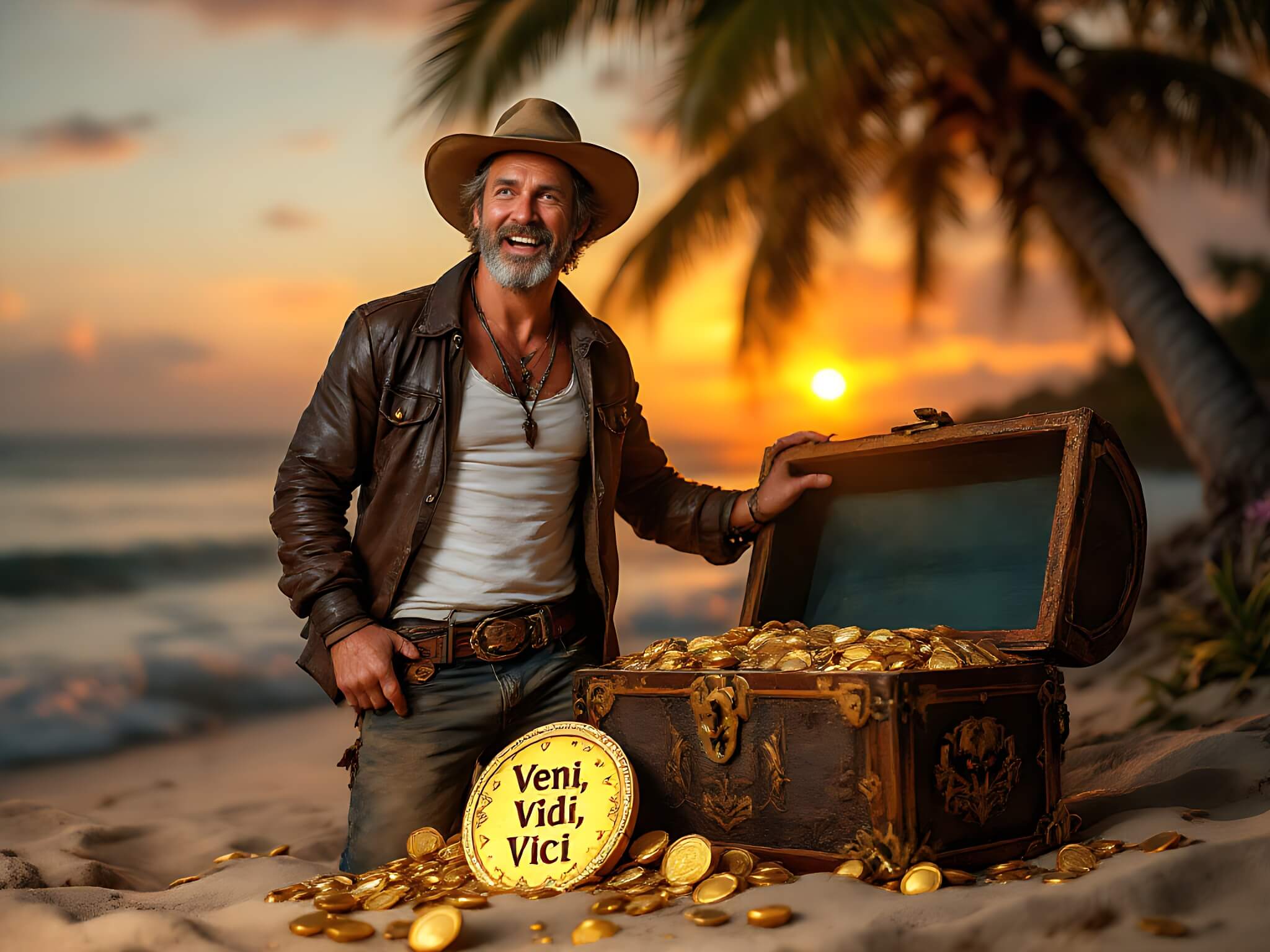 A dynamic image of a treasure hunter celebrating a successful find, symbolizing the excitement and fulfillment of treasure hunting.